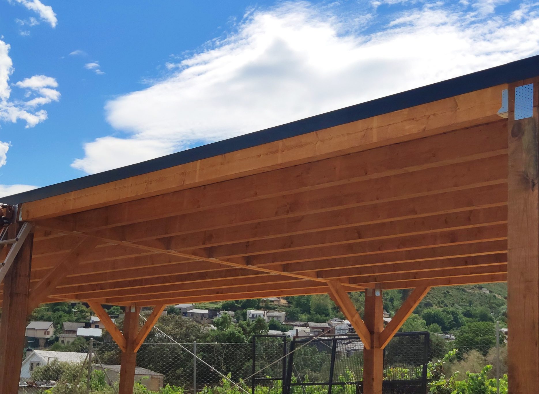 Descripción: Construcción de una pérgola sobre pilares de madera para proteger vehículos de la exposición al sol. Estructura de madera con aislamiento de placas de poliestireno. Colocación del sistema de desagüe.