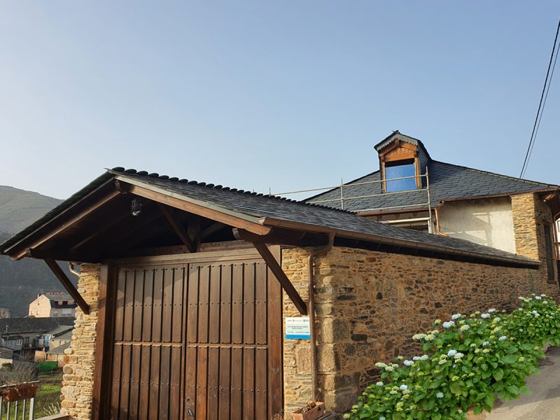 Cubierta: Instalación de una cubierta nueva de pizarra 32×22. Estructura de madera nueva, entablonado, rastrelado con aislamiento térmico de placas de poliestireno de 4. Chimenea revestida de pizarra con sombrerete, canalones y bajantes de aluminio.